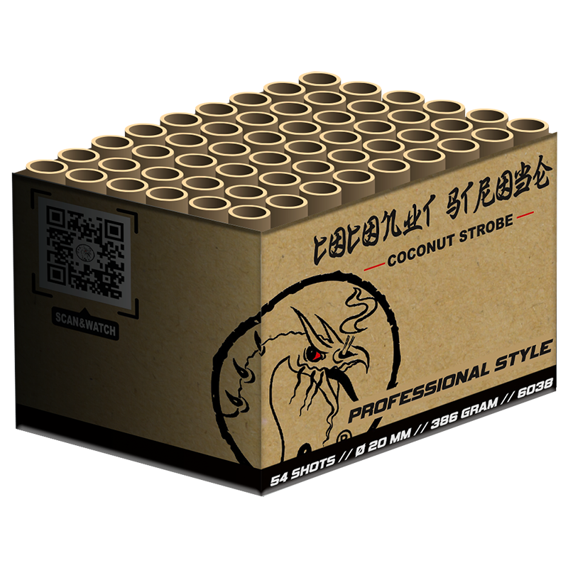 Coconut Strobe 54 shots 20mm. Dit is een prachtige siercake met maar liefst 54 schoten siervuurwerk. In een rap tempo zet deze Coconut Strobe zijn mix aan siereffecten weg. Het is hierdoor een waar spektakel, waar geen moment stilte in valt. Als dikke afsluiter geeft deze cake nog een vette salvo met meerdere schoten tegelijkertijd om de hemel compleet te vullen.