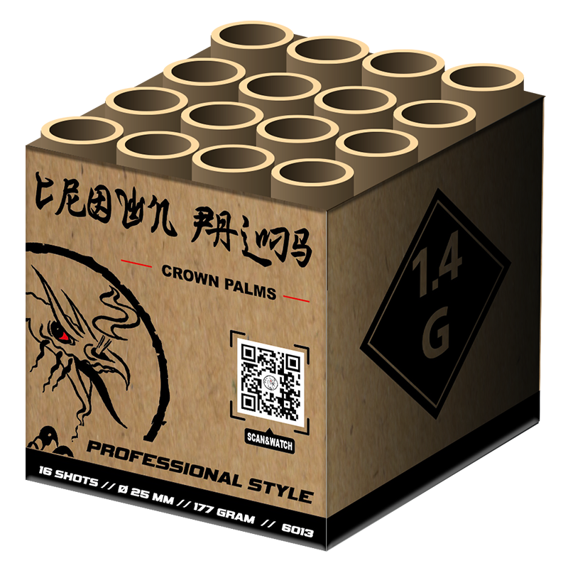 Crown Palms 16 shots 20mm. Deze kleine cake uit de Professional Style serie bevat uitmuntende schoten siervuurwerk opgebouwd uit sierlijke palms met rode of groene briljanten, stevige brocade crown met rode of groene tips, afgewisseld met een schots knetterende crackling.