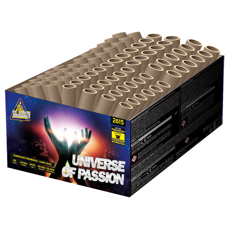 Evolution Fireworks neemt je mee naar het Universe of Passion. En dat is er een! Met 85 schoten ultiem siervuurwerk laat jij je passie voor vuurwerk zien. Direct al in de opening schiet deze compound een heldere fanshape schitterend de lucht in. Gevolgd door geweldige siereffecten in Z-shape geschoten. Dus zorg dat je de ruimte hebt om deze box af te steken! Niet voor smalle straten.